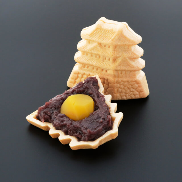 形はお城、中には栗がまるごと1つ使用していますので、甘さ控えめのつぶあんと栗のハーモニーをお楽しみ下さい。